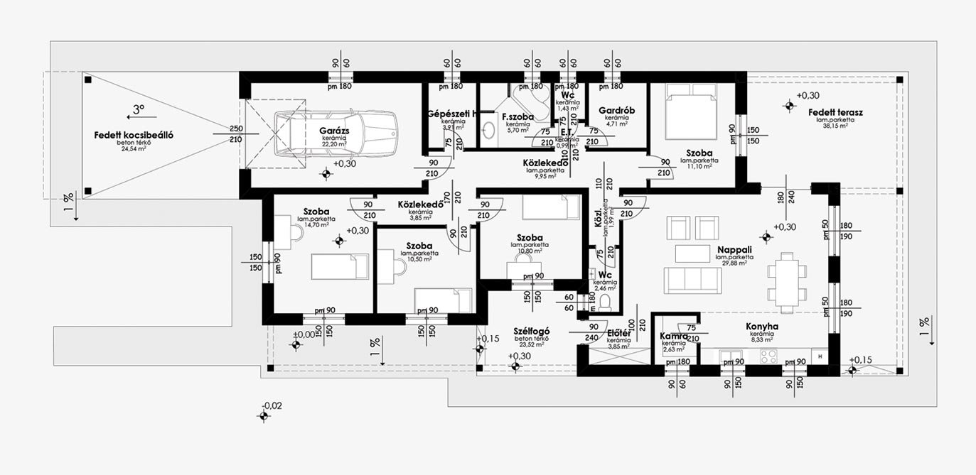 A Betti névre keresztelt háztípusunk a tágasság és a kényelem megtestesítője, melyet a modern kor elvárásainak megfelelően terveztünk. Képzelje el, ahogy a tágas, 29,88 m²-es nappaliban összegyűlik a család, vagy ahogy a 35,15 m²-es fedett teraszon élvezi a reggeli kávéját, madárcsicsergés közepette. Ez az otthon tökéletes választás nagyobb családoknak, vagy akár több generáció együttélésére is, hiszen a négy különálló szoba és a jól elkülönített közösségi terek mindenki számára biztosítják a privát szférát és a közös élmények lehetőségét is. A Betti ház praktikus elrendezése – a kamrával kiegészített konyha, a különálló WC és a tágas fürdőszoba – a mindennapok kényelmét szolgálja.