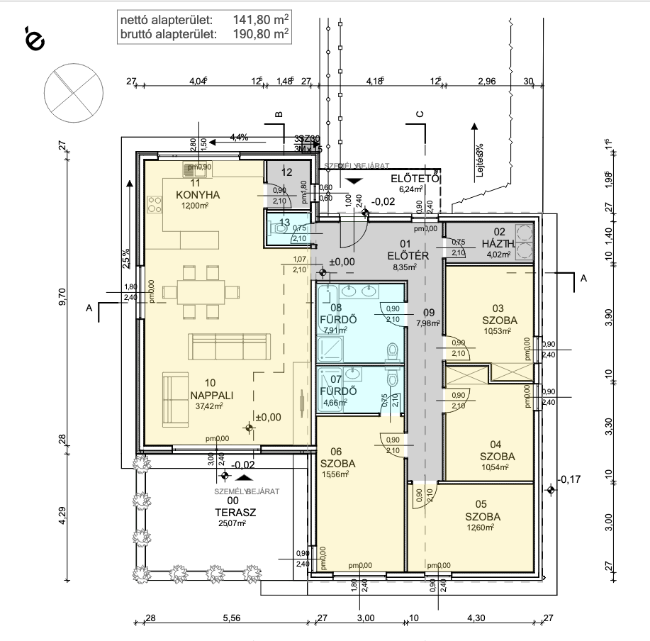 A ház alaprajza intelligensen különíti el a nappali, nyüzsgő „nappali zónát” az éjszakai pihenő részlegtől. A 141,80 m²-es nettó alapterületen négy, kényelmes méretű hálószoba kapott helyet, melyek egy külön folyosóról nyílnak, biztosítva a családtagok nyugalmát. A reggeli csúcsidő többé nem jelent problémát, köszönhetően a két különálló, tágas fürdőszobának (egy 7,91 m²-es és egy 4,68 m²-es), valamint a bejárat mellett található praktikus háztartási helyiségnek.