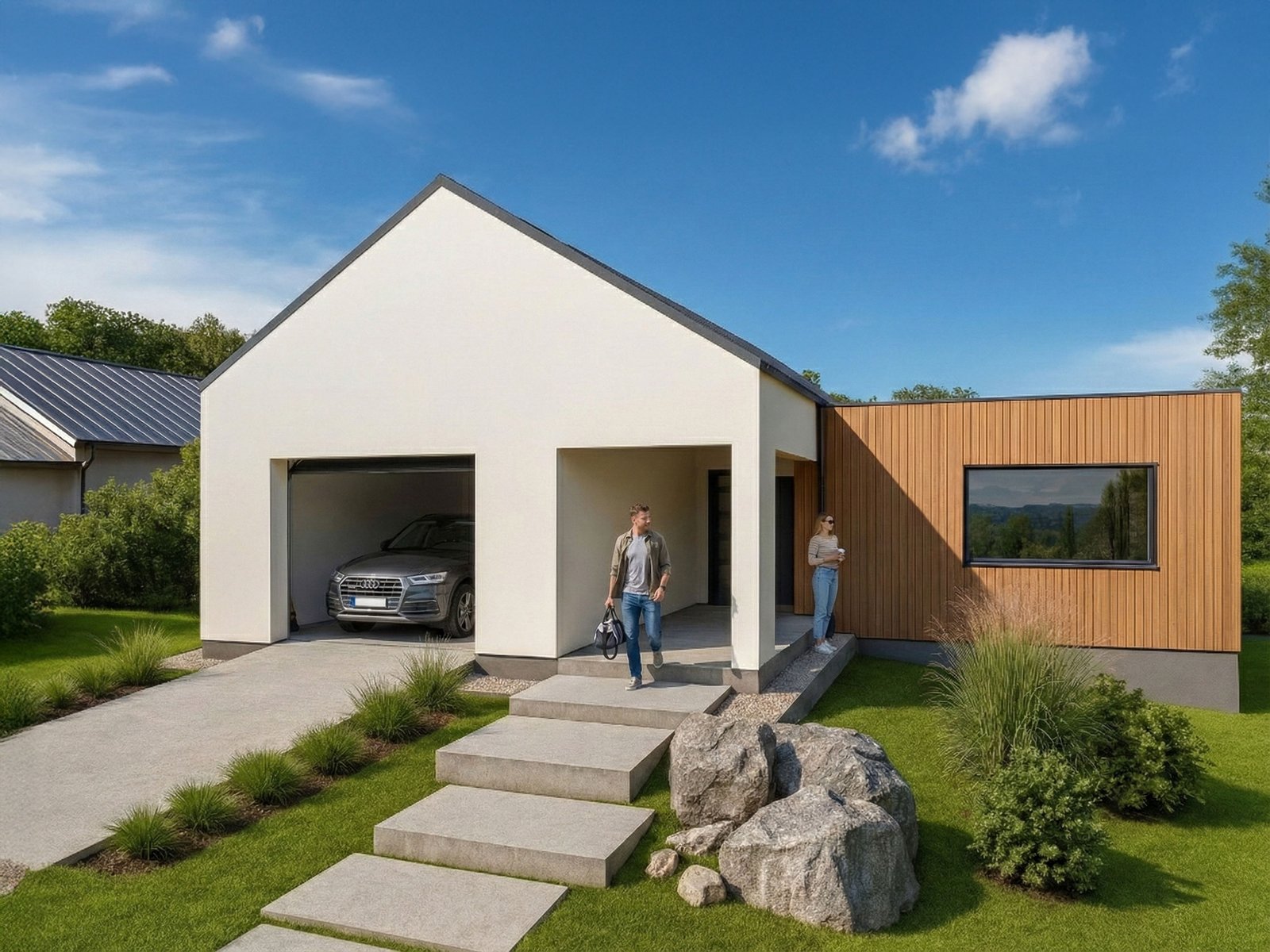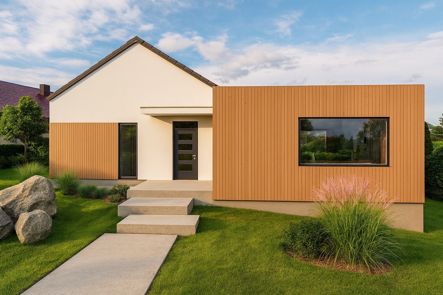 Ez az otthon modern SIP (Structural Insulated Panel) technológiával épül. Ez egy háromrétegű építőpanel, amely két OSB-lap között zárt, nagy hatékonyságú hőszigetelő magot tartalmaz. A gyárban, milliméter pontosan készülő elemek nemcsak kiemelkedő statikai stabilitást , hanem passzívház-szintű hőszigetelést is biztosítanak. Ez a gyakorlatban alacsony rezsiköltséget és jelentős energiamegtakarítást jelent. Az építkezés rendkívül gyors: egy kulcsrakész ház akár 120-160 nap alatt elkészülhet , időjárástól függetlenül és szinte hulladékmentesen.