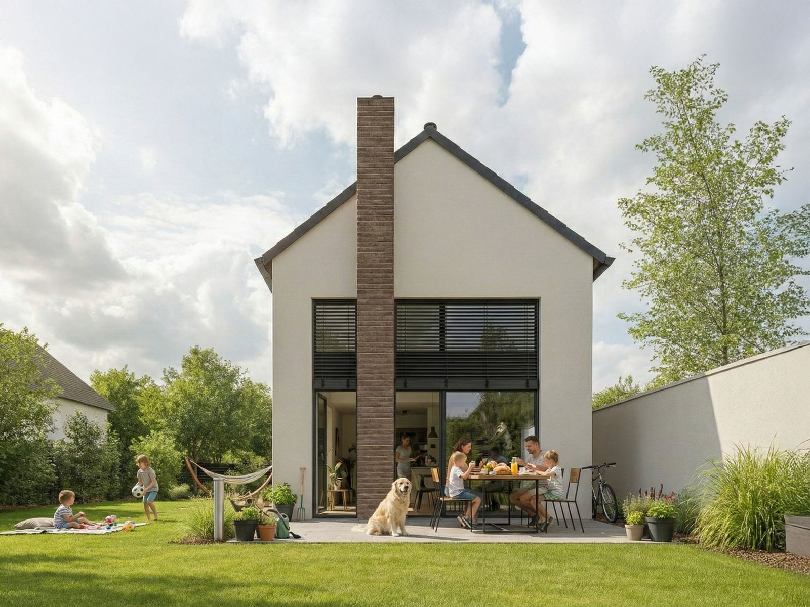 Ez az otthon ideális választás pároknak vagy kisebb családoknak. Az okos elrendezés három hálószobát és két zuhanyzós fürdőszobát biztosít. A földszinti, 9,40 m²-es hálószoba egy kényelmes, 5,05 m²-es gardróbbal kiegészülve tökéletes szülői lakrész, de kialakítható dolgozószobának vagy vendégszobának is. Az emelet a gyerekek vagy a pihenés birodalma lehet: két külön szoba (8,77 m² és 9,04 m²), egy saját fürdő (4,53 m²) és egy hangulatos, 5,48 m²-es galéria várja, ahonnan letekinthet a nappali nyüzsgésére.