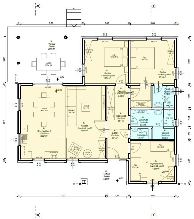 Az Endre típusház egy L-alakú elrendezésű, modern otthon, amelyet a tágas közösségi terek és az átgondolt privát zónák tökéletes harmóniája jellemez. A ház szíve a több mint 41 m²-es, egybenyitott konyha-étkező-nappali tér. Ez a világos, nyitott terület ideális helyszín a családi vacsorákhoz vagy baráti összejövetelekhez, ahonnan egyetlen lépéssel a 21 m²-es, napfényes teraszra léphetünk. A konyhához tartozó praktikus kamra (2,1 m²) pedig segít rendet tartani a mindennapokban.