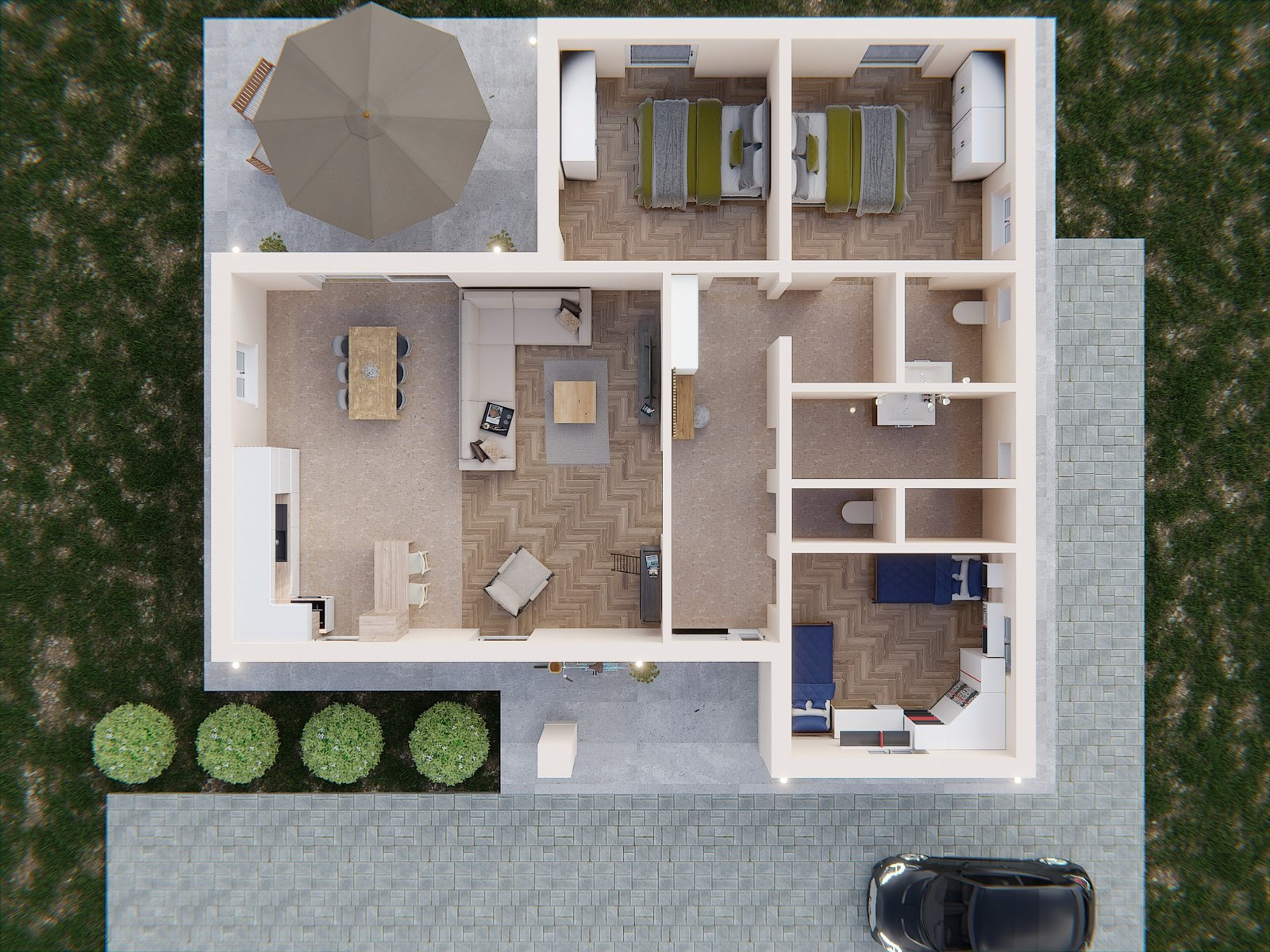 Ez a ház ideális választás 4-5 fős családok számára. A három hálószoba (12-14 m² közötti méretekben) biztosítja a kényelmes elvonulást minden családtag számára. Az Endre ház egyik legnagyobb előnye a fürdőszobák átgondolt kiosztása: a reggeli készülődés többé nem jelent kihívást, hiszen a kádas fürdőszoba (5,17 m²) mellett egy zuhanyzós fürdő (5,15 m²) és egy különálló vendég WC (1,63 m²) is rendelkezésre áll. A közlekedőből nyíló külön gardrób (3,05 m²) pedig bőséges tárolóhelyet kínál.