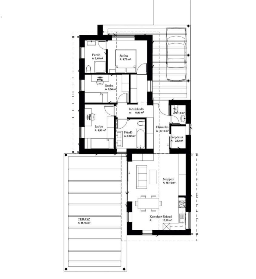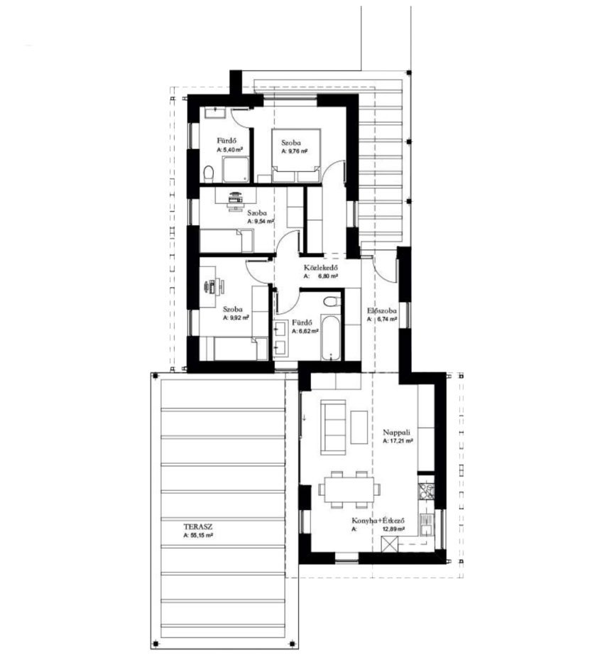 Képzelje el, ahogy a tágas, több mint 31 m²-es nappali-konyha-étkezőből egyetlen lépéssel a hatalmas, közel 32 m²-es teraszra lép! A Flamenco modellt úgy terveztük, hogy a közösségi tér és a természet kapcsolata harmonikus egységet alkosson, tökéletes helyszínt biztosítva a családi összejöveteleknek és a baráti beszélgetéseknek. Ez az otthon ideális választás 3-4 fős családok számára, ahol a három különnyíló hálószoba mindenkinek biztosítja a nyugodt elvonulás lehetőségét. A ház különlegessége a két teljes értékű fürdőszoba, ami a reggeli készülődés során felbecsülhetetlen kényelmet nyújt a mindennapokban.