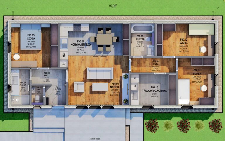 Ami igazán kiemeli ezt a típust az átlagos 90 négyzetméteres házak sorából, az a „nagyvonalú” kiszolgálóhelyiség-kínálat. Ritka kincs ekkora alapterületen, hogy két teljes értékű fürdőszoba is rendelkezésre áll: egy kádas fürdő a relaxáláshoz, és egy külön zuhanyzós helyiség a gyors reggeli készülődéshez, ráadásul ezeken felül még egy különálló WC is helyet kapott. A háziasszonyok és a rendszerezett otthon kedvelőinek nagy kedvence lesz a 8 m²-es, külön bejáratú tároló-mosókonyha, amely elrejti a háztartási gépeket és a ritkábban használt eszközöket, így a lakótér mindig rendezett maradhat.