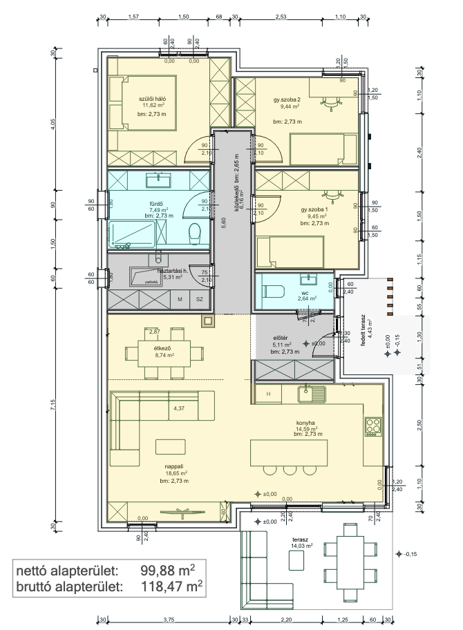 A ház másik fele a pihenésé és a nyugalomé. A közlekedőn (8,16 m²) keresztül jutunk el a privát zónába, ahol három hálószoba található (9,90 m², 9,45 m² és 9,44 m²). Ez a tudatos elválasztás biztosítja, hogy a vendégek fogadása ne zavarja a család többi tagjának pihenését. A praktikumot tovább növeli a különálló WC (1,53 m²), a tágas fürdőszoba (5,90 m²) és a dedikált háztartási helyiség (5,31 m²), ahol kényelmesen elfér a mosó- és szárítógép, valamint a tárolóbútorok is.