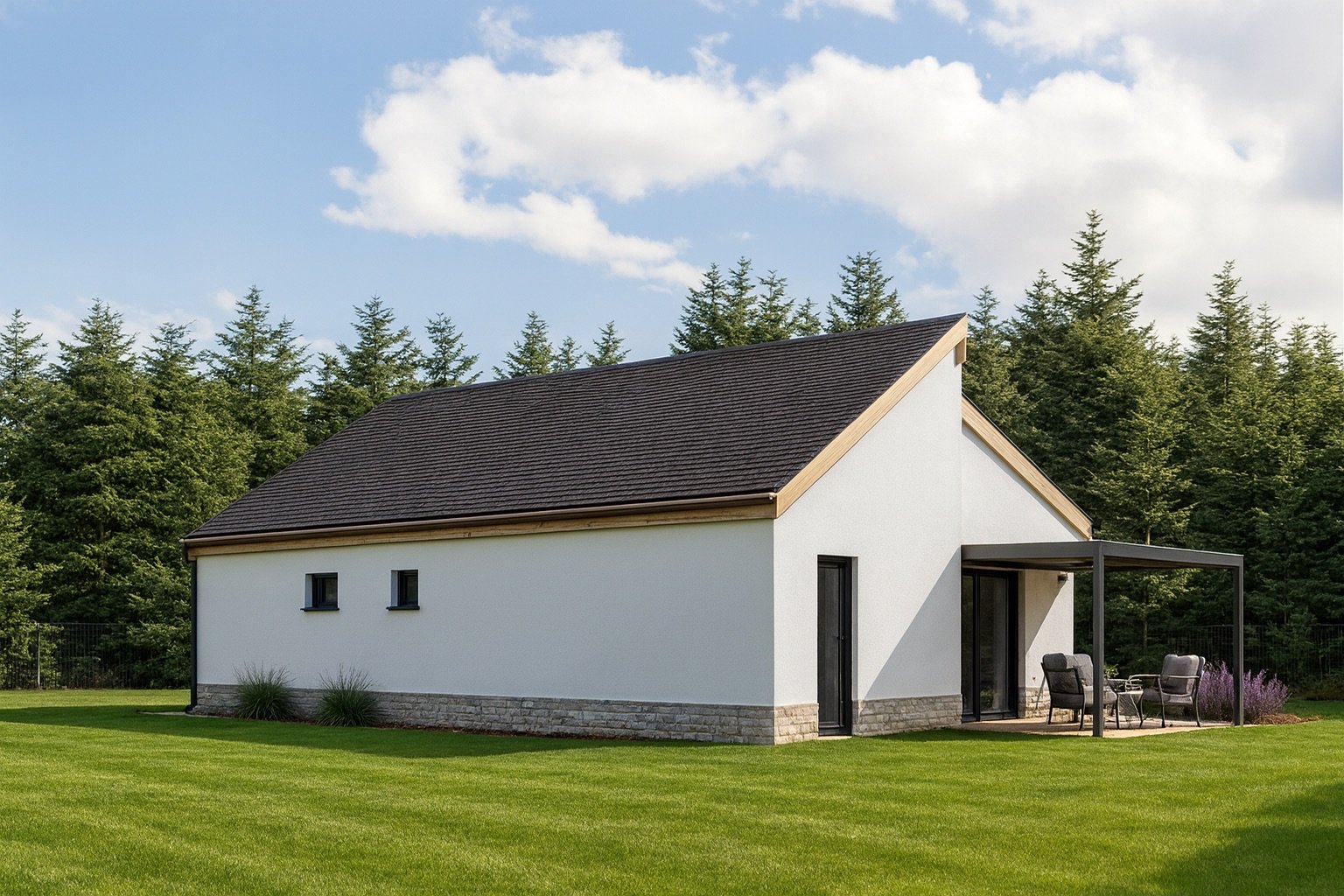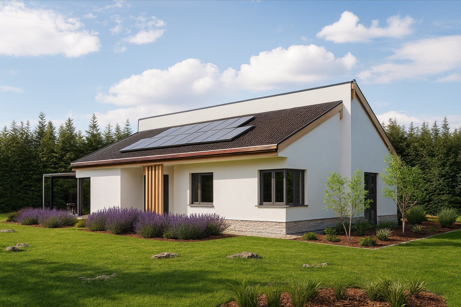 A ház alapját a modern SIP technológia adja. Ez egy háromrétegű, nagy teherbírású építőpanel, amely két OSB-lap között egy zárt hőszigetelő magot tartalmaz. Ennek a szerkezetnek köszönhetően az épület kivételes hőszigetelési képességgel és statikai stabilitással bír. A paneleket milliméter pontosan, üzemi körülmények között gyártják , így a helyszíni munka tiszta és rendkívül gyors : egy kulcsrakész SIP-ház akár 120-160 nap alatt is felépülhet. Ez a technológia passzívház-szintű szigetelést tesz lehetővé, ami alacsony rezsiköltséget és jelentős energiamegtakarítást eredményez. Emellett a felhasznált anyagok formaldehid-mentesek, víz- és tűzállók, valamint földrengésbiztosak.