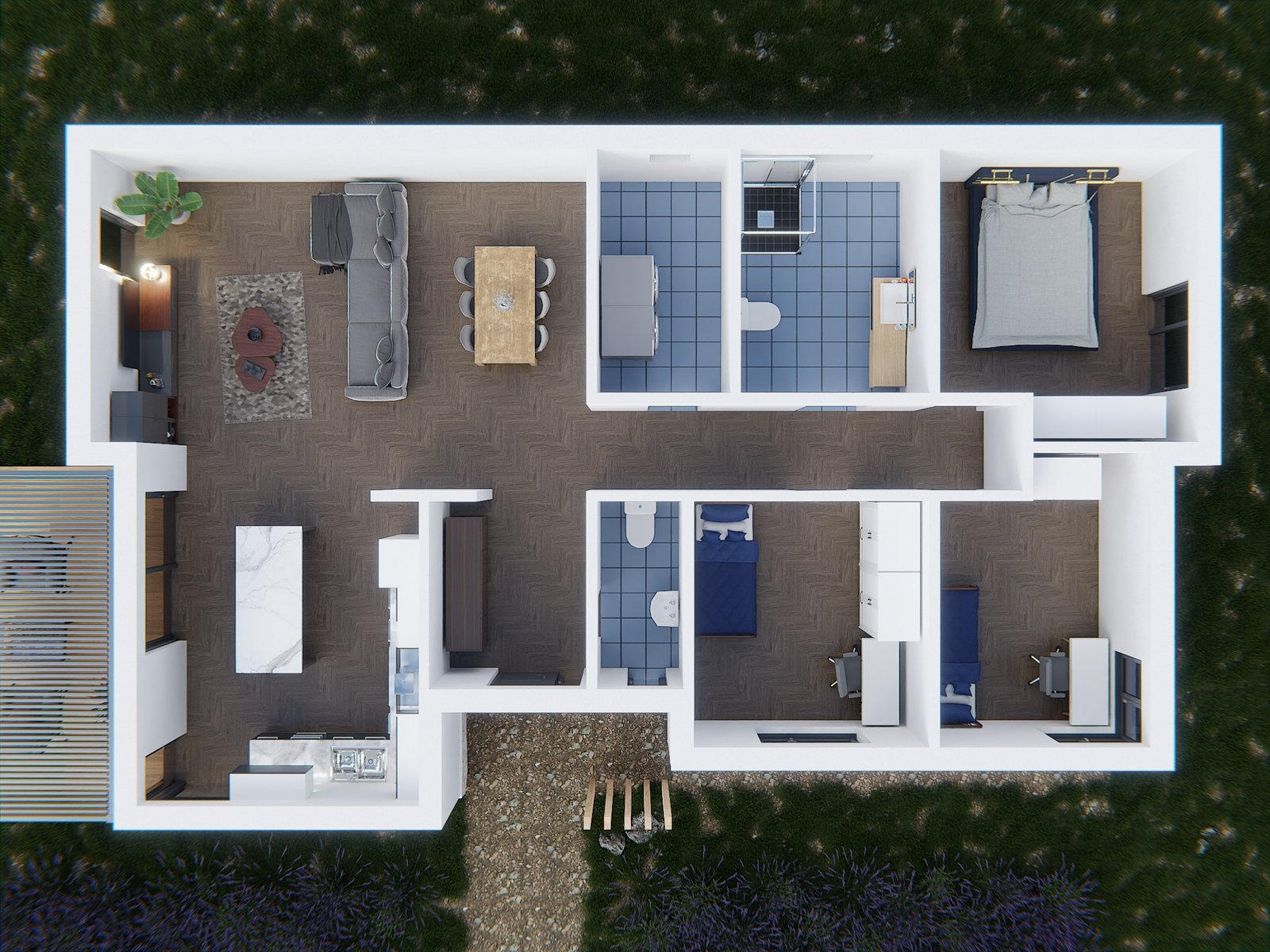 Ezt a típusházat elsősorban 3-4 fős családoknak ajánljuk, ahol a szülők és a gyermekek is saját, külön bejáratú szobára vágynak. Ideális választás azoknak, akik egy kompakt, mégis tágas érzetű otthont keresnek, ahol a funkció és a kényelem kéz a kézben jár. A nappaliból nyíló két terasz (egy 14,03 m²-es és egy 4,43 m²-es fedett terasz) pedig kiváló lehetőséget nyújt a kerti pihenésre, összekötve a belső tereket a természettel.