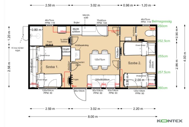 Ez a típus különösen vonzó a családok és a baráti társaságok számára, hiszen az alaprajz két különálló, privát szférát biztosító hálószobát kínál. A „Szoba 1” és „Szoba 2” elrendezése lehetővé teszi, hogy négy ember kényelmesen, egymás zavarása nélkül pihenhessen, így ideális választás kétgyermekes családoknak vagy olyan pároknak, akik gyakran fogadnak vendégeket. Az okos térkihasználásnak köszönhetően a 2,50 és 2,60 méter között változó belmagasság levegős érzetet ad, elkerülve a bezártság érzését, ami a hagyományos kis házaknál gyakori probléma.