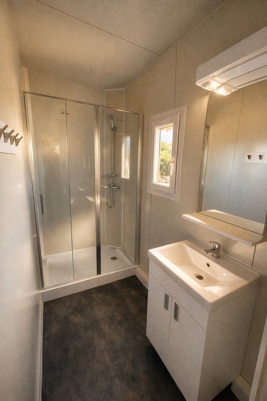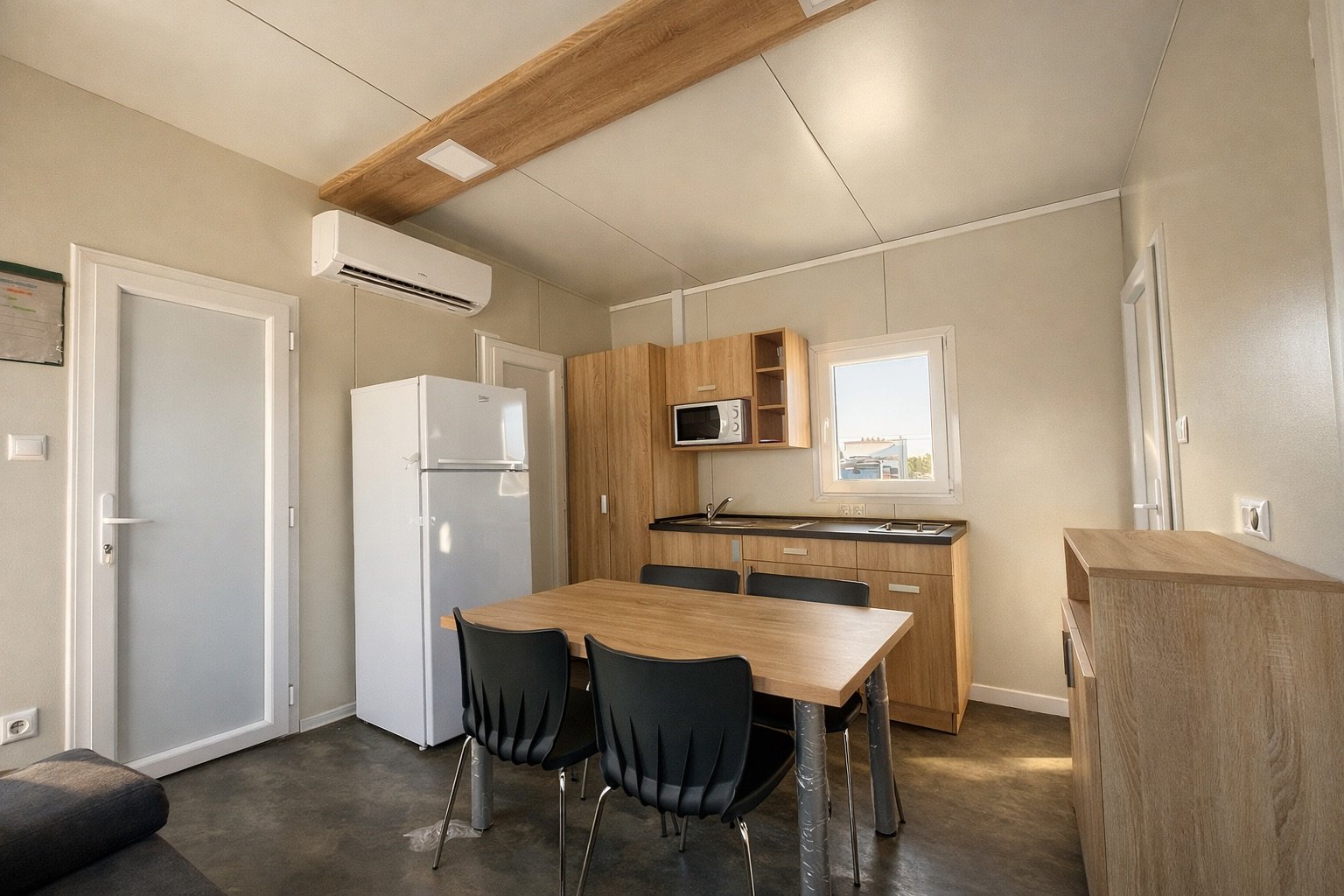 Ez a 32 m²-es mobilház a modern szabadság és a praktikus kényelem megtestesítője, amely azonnal otthonos melegséget áraszt, amint belép az ajtón. A 8,00 x 4,00 méteres alapterület minden egyes centimétere tudatos tervezés eredménye, hogy a belső tér tágasabbnak hasson, mint azt elsőre gondolná. A központi élettér a ház szíve, ahol a konyha, az étkező és a nappali egysége hívogat közös főzésekre és esti beszélgetésekre, miközben a hatalmas ablakokon keresztül folyamatos a kapcsolat a külvilággal.