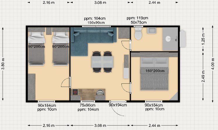 A házat úgy alakították ki, hogy négy személy számára is teljes értékű életteret biztosítson, legyen szó állandó lakhatásról vagy nyaralásról. Az épület egyik felében egy franciaággyal felszerelt, 160×200 cm-es ágyat befogadó hálószoba található, míg a másik oldalon egy különálló szoba kapott helyet két darab 90×200 cm-es ággyal. Ez az elrendezés tökéletes intimitást nyújt a szülőknek és a gyerekeknek, vagy akár vendégek fogadására is kiválóan alkalmas.