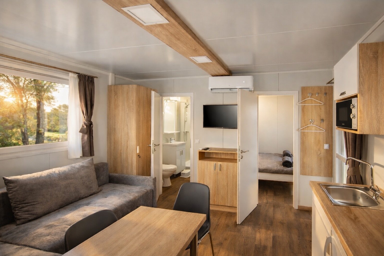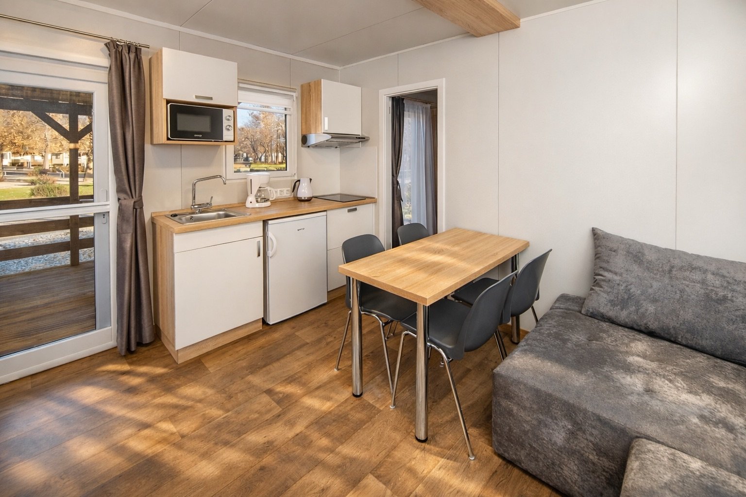 Ez a 32 m²-es, 8×4 méteres alapterületű mobilház a modern mérnöki tervezés és az otthonos kényelem találkozása, amely tágasabb belső teret kínál, mint azt elsőre gondolnánk. Az elrendezés központi eleme a világos, amerikai konyhás nappali, ahol egy kényelmes L-alakú kanapé és egy négyszemélyes étkezőasztal várja a lakókat. A nagy méretű ablakoknak köszönhetően a belső tér természetes fényben úszik, a funkcionális konyhasarok pedig minden szükséges eszközt tartalmaz a mindennapi főzéshez vagy egy hétvégi villásreggeli elkészítéséhez.