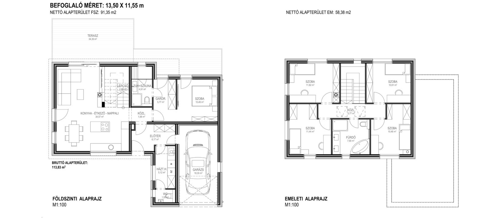 Képzelje el, hogy egy olyan otthonban él, ahol a terek tökéletesen szolgálják a család mindennapjait. A Körös típusház bruttó 110,83 m2-es földszintje és 68,38 m2-es emeleti nettó alapterülete egy okosan megtervezett életteret rejt. A földszint a közösségi élet központja: a több mint 37 m2-es, teraszkapcsolatos nappali-konyha-étkező tökéletes helyszín a közös vacsorákhoz vagy a hétvégi pihenéshez. Ezen a szinten kapott helyet egy 8,5 m2-es szoba is, amely ideális dolgozószobának vagy vendégszobának, valamint a praktikus tárolók és a 22 m2-es garázs. Az emelet a privát szféra birodalma: három kényelmes hálószoba (15,4 m2, 13,9 m2, 12,3 m2), egy tágas fürdőszoba, egy külön WC és egy 4,8 m2-es gardrób biztosítja a nyugalmat. Ez a ház ideális választás 3-5 fős családok számára, akik egy modern, világos otthont keresnek, ahol a közösségi és privát funkciók tökéletes egyensúlyban vannak.