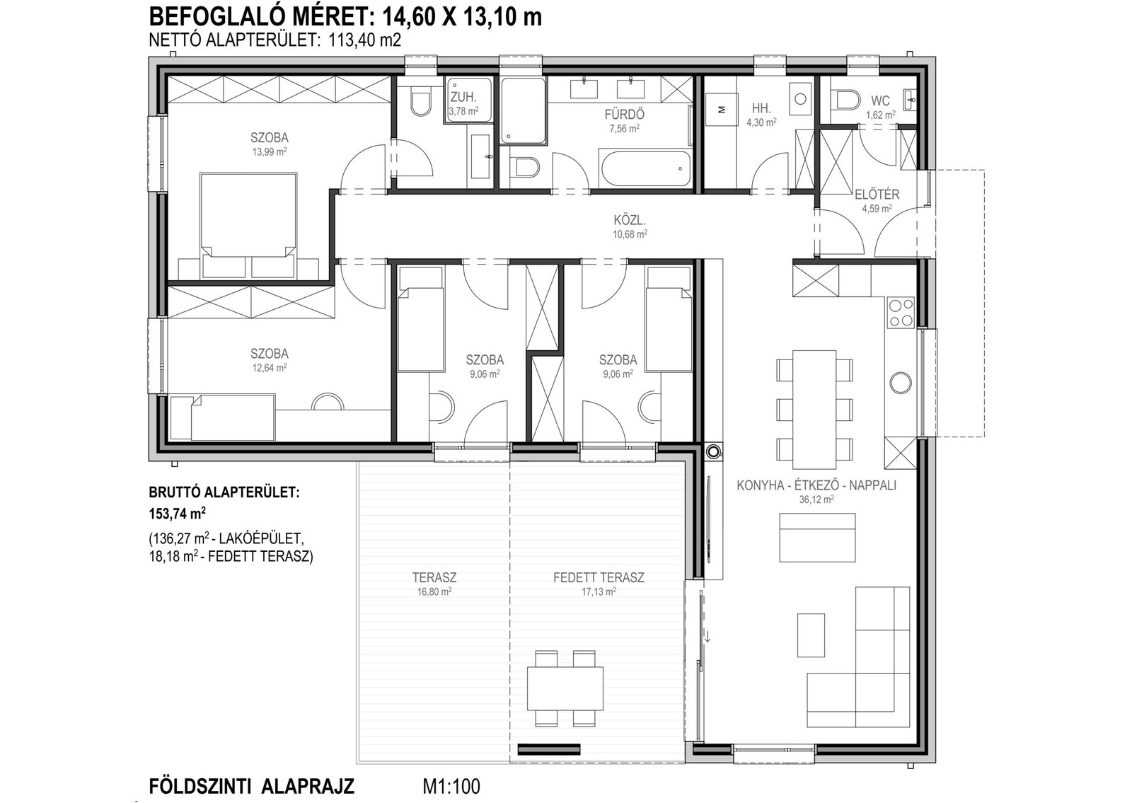 A Rábca típusház egy igazi családi fészek, melyet a tágas terek és az átgondolt elrendezés jellemez. A ház nettó 113,40 m²-es alapterületén egyértelműen elkülönül a közösségi és a privát zóna. A ház szíve a hatalmas, 38 m²-es konyha-étkező-nappali tér, amely közvetlen kapcsolatban áll a nagyvonalú, részben fedett terasszal. Ez a ház tökéletes választás 4-5 fős családok számára. Négy hálószobájából a két nagyobb (13,99 m² és 12,94 m²) kényelmes szülői és vendég- vagy dolgozószobaként funkcionálhat, míg a két kisebb (8,46 m² és 9,06 m²) ideális gyerekszoba. A reggeli csúcsidőt a két teljes értékű vizesblokk (egy kádas fürdő és egy zuhanyzó), valamint egy különálló WC teszi gördülékennyé. A praktikumról a külön háztartási helyiség is gondoskodik.