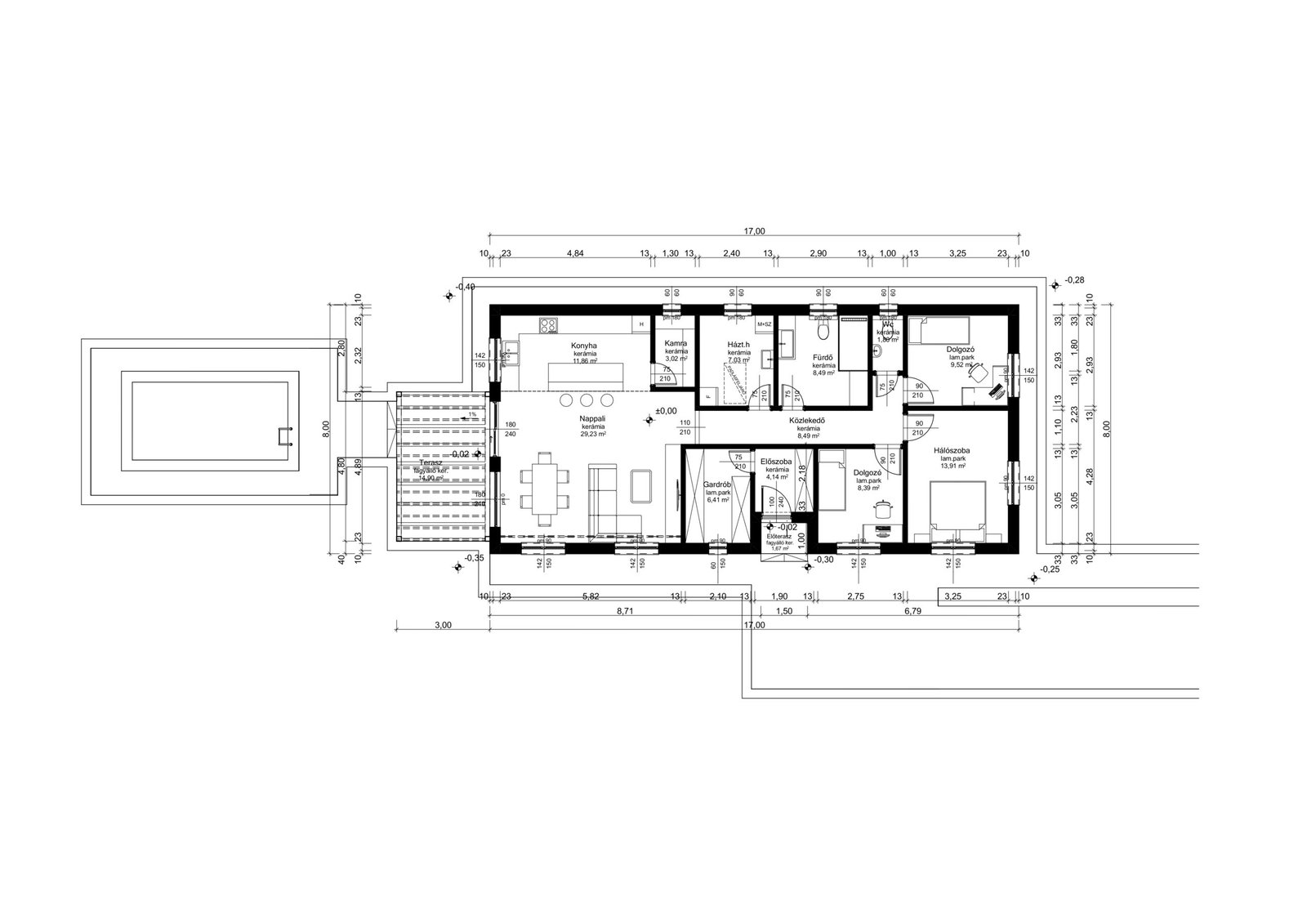 A Tavasz ház egyik legnagyobb különlegessége a két különálló dolgozószoba. Ez a kialakítás páratlan lehetőséget nyújt azoknak a pároknak vagy családoknak, ahol többen is otthonról dolgoznak. A szobák természetesen rugalmasan alakíthatók, így könnyedén válhatnak hangulatos gyerekszobává, vendégszobává vagy hobbivá alakított privát kuckóvá. Az átgondolt tervezésről tanúskodik a két külön WC, a praktikus kamra és a tágas gardrób is, amelyek a mindennapok kényelmét szolgálják. A hálószoba a ház legtávolabbi, legcsendesebb pontján kapott helyet, garantálva a tökéletes feltöltődést.