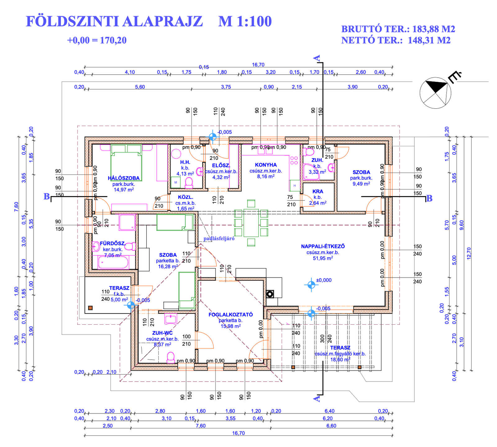 A Skuld 148 alaprajzát a mindennapi élet praktikus igényei formálták. A négy szoba mellett két teljes értékű fürdőszoba és egy külön zuhanyzó-WC is helyet kapott, ami egy nagyobb család esetében felbecsülhetetlen értékű a reggeli készülődés során. A szülői hálószoba saját fürdővel és gardróbbal rendelkezik, megteremtve a nyugalom és az intimitás szigetét. A konyhához tartozó kamra, valamint a közlekedőben kialakított tárolóhelyiségek pedig segítenek rendet tartani. Az átgondolt elrendezésnek köszönhetően a ház logikusan tagolódik egy közösségi és egy privát zónára, így a család eltérő életritmusa nem zavarja egymást. A házat két oldalról is körbeölelő, összesen több mint 30 m²-es terasz pedig páratlan kapcsolatot teremt a kerttel és a természettel.
